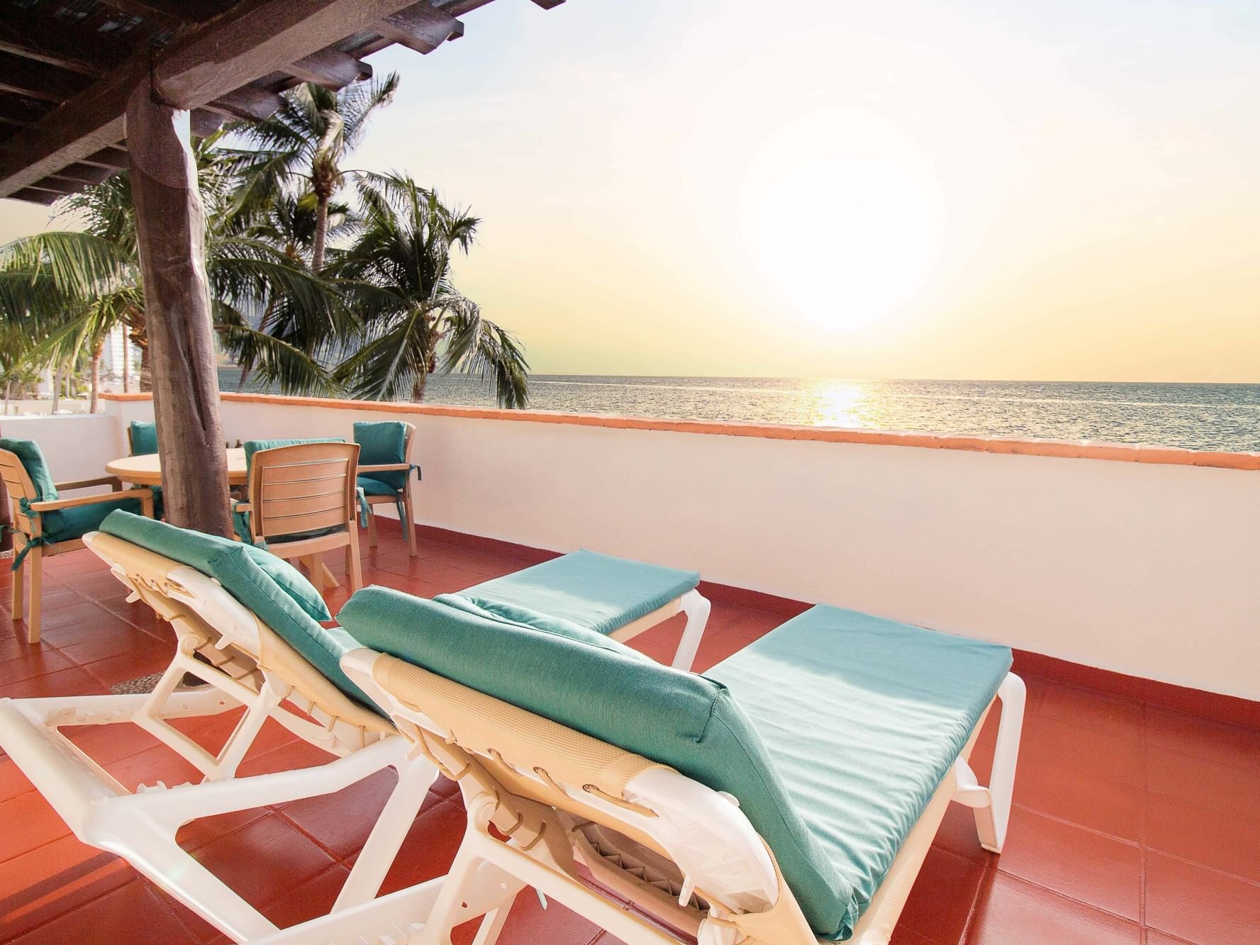 Pensada para disfrutar en pareja o familia, esta suite cuenta con una terraza privada equipada con dos camastros y una mesa con sillas, el lugar perfecto para contemplar juntos los inolvidables atardeceres de Puerto Vallarta.